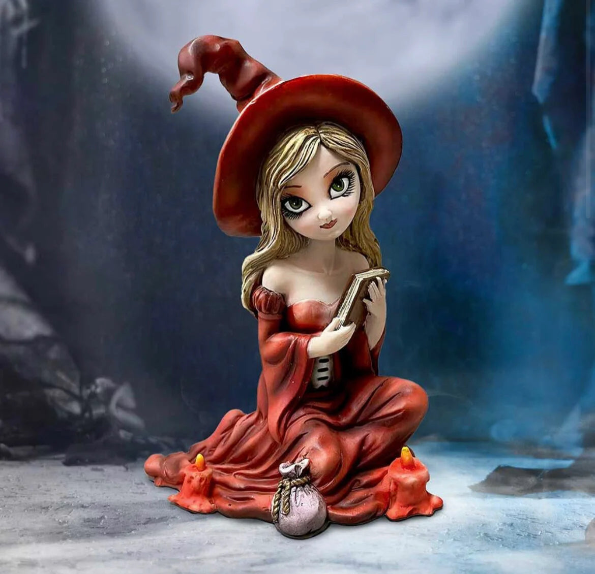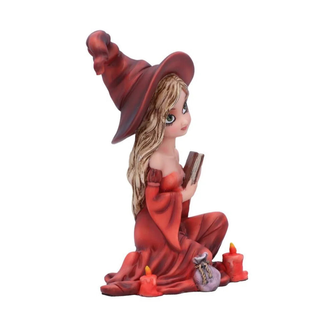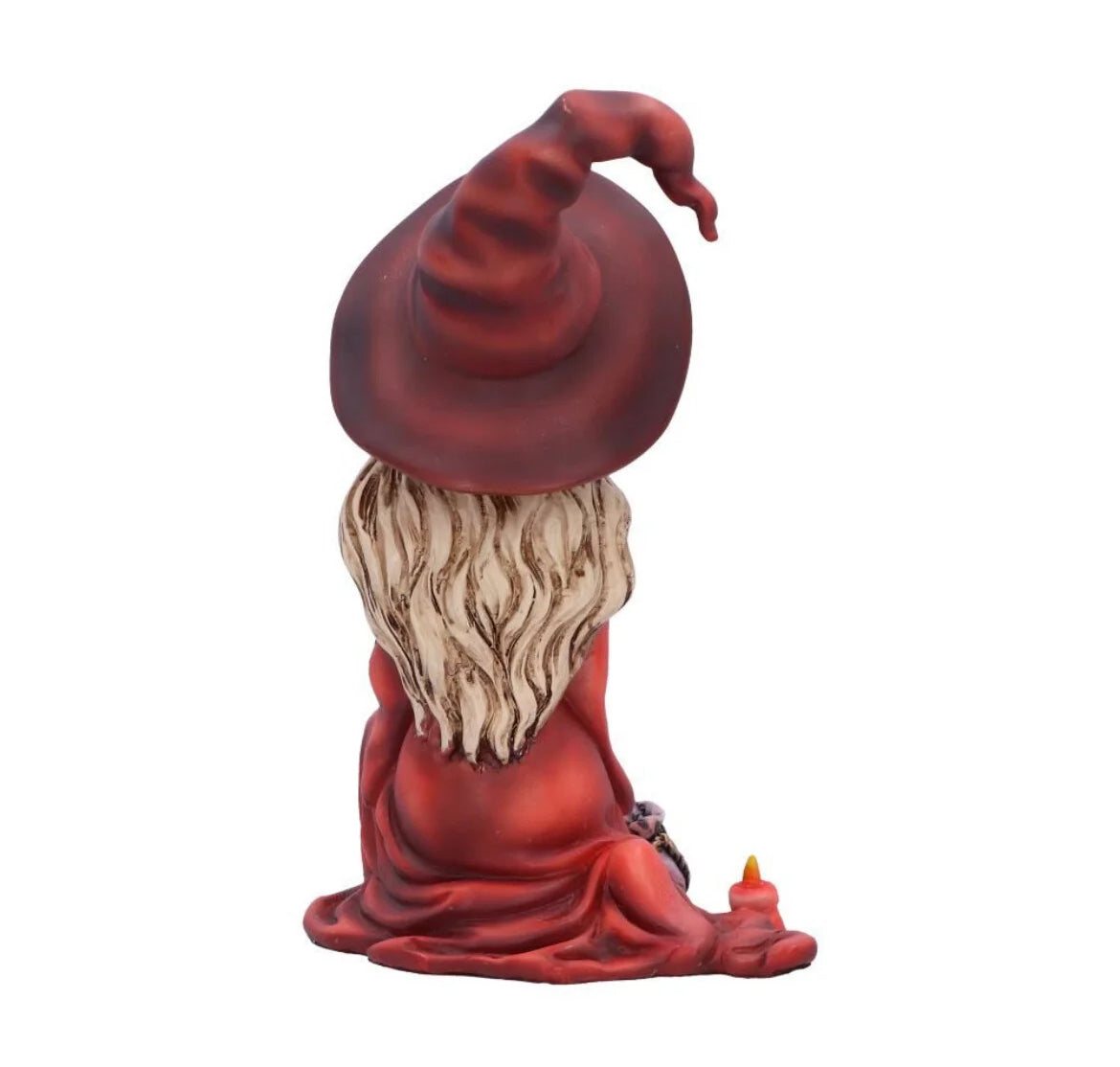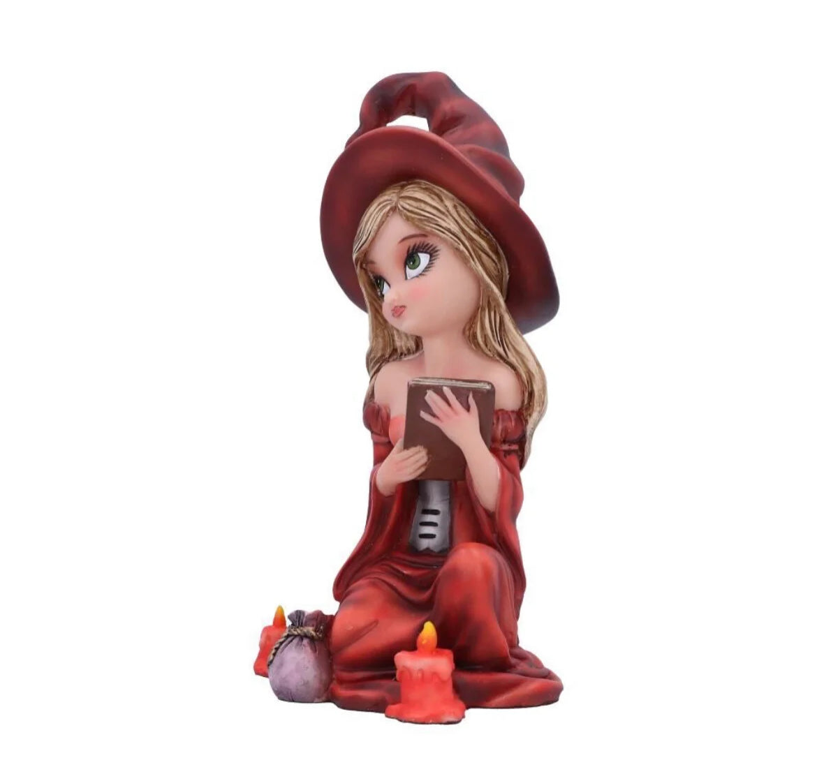 Sitting peacefully holding a book close to her chest is Rina. Wearing a red flowing dress and red witches hat she gazes longingly into the distance. Cast in the finest resin and carefully hand-painted, this small witch is the perfect gift for your witchy pals.