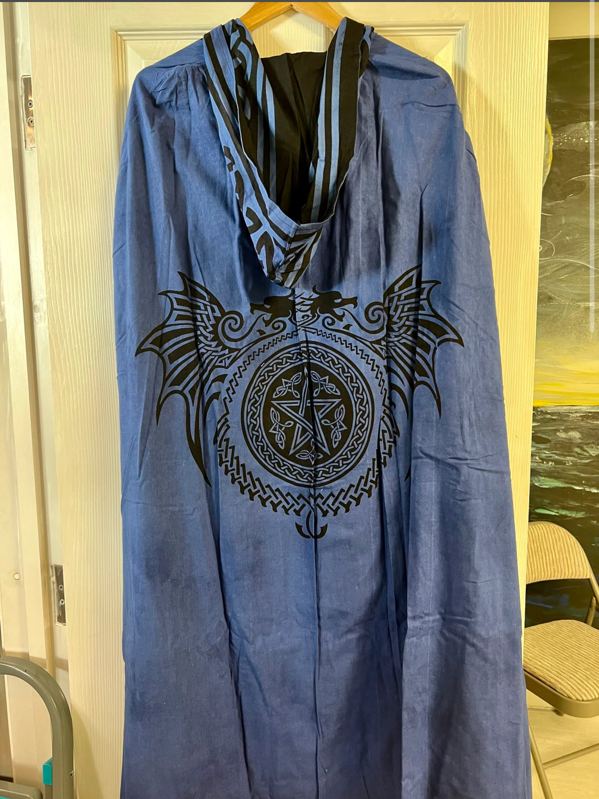Two for the price of one, with this beautiful cloak/robe . Decorated with Celtic borders, this cloak is a bargain. It also has arm holes, so no more lynching yourself when you raise your arms. Choose blue with black patterning, or flip it for black with blue patterning.