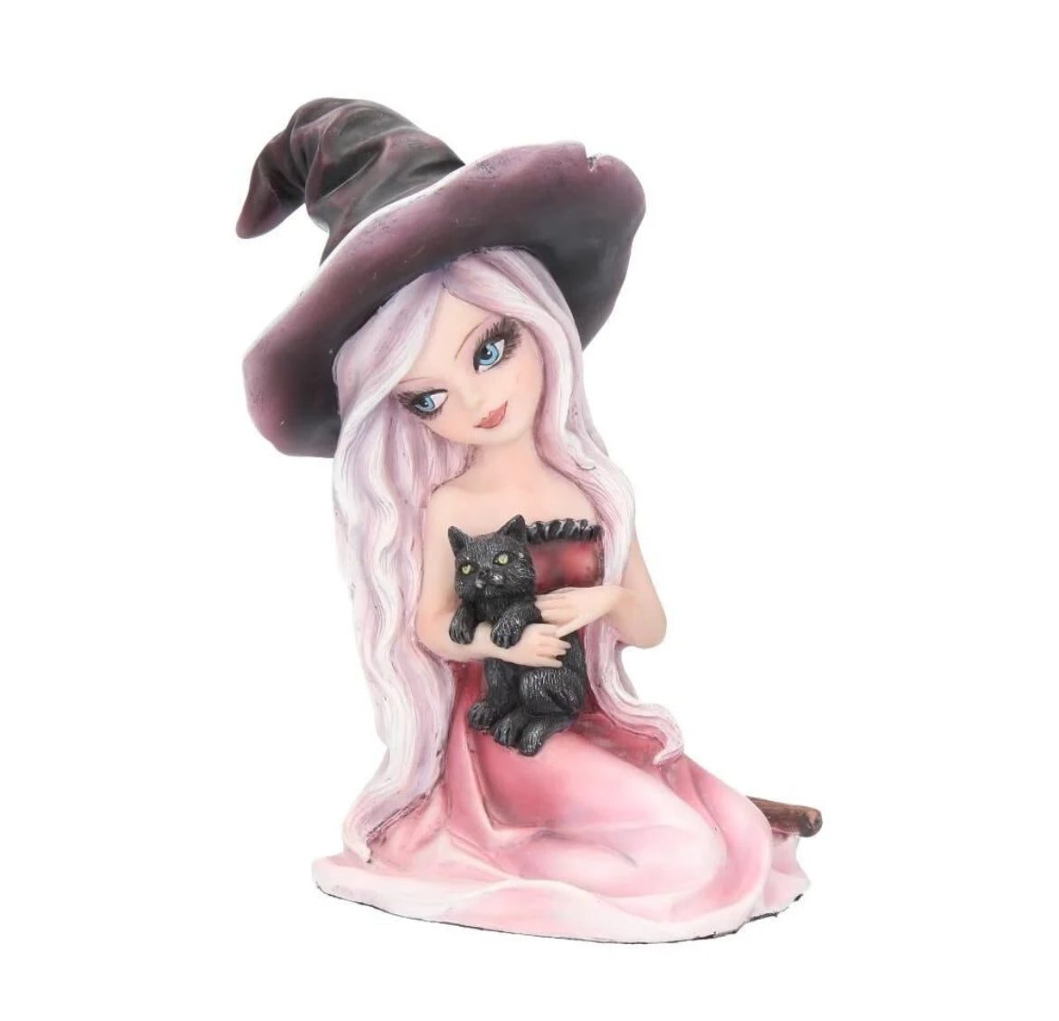 Cast in the finest resin and carefully hand-painted, this small witch is the perfect gift for your witchy pals. Wearing a dusty pink dress and a deep aubergine pointed hat, Rosa kneels on the ground cradling her black cat familiar. Her face is made-up and beautifully framed by her light platinum hair, detailed with pink highlights.