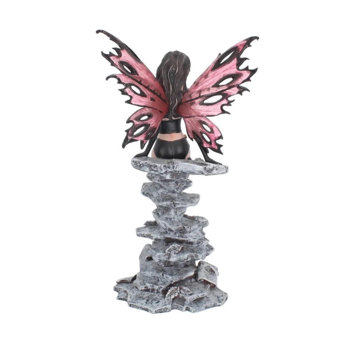 Leaning against a stone pillar, this fairy casually leans, legs clad in black stockings. Her red and black wings are extended behind her, as her chestnut brown hair falls over her shoulders. Around her feet are the fragments of a gothic church, in room and almost beyond recognition. Cat in the finest resin and carefully hand painted, this figurine is perfect for the admirer of enchanting darkness.