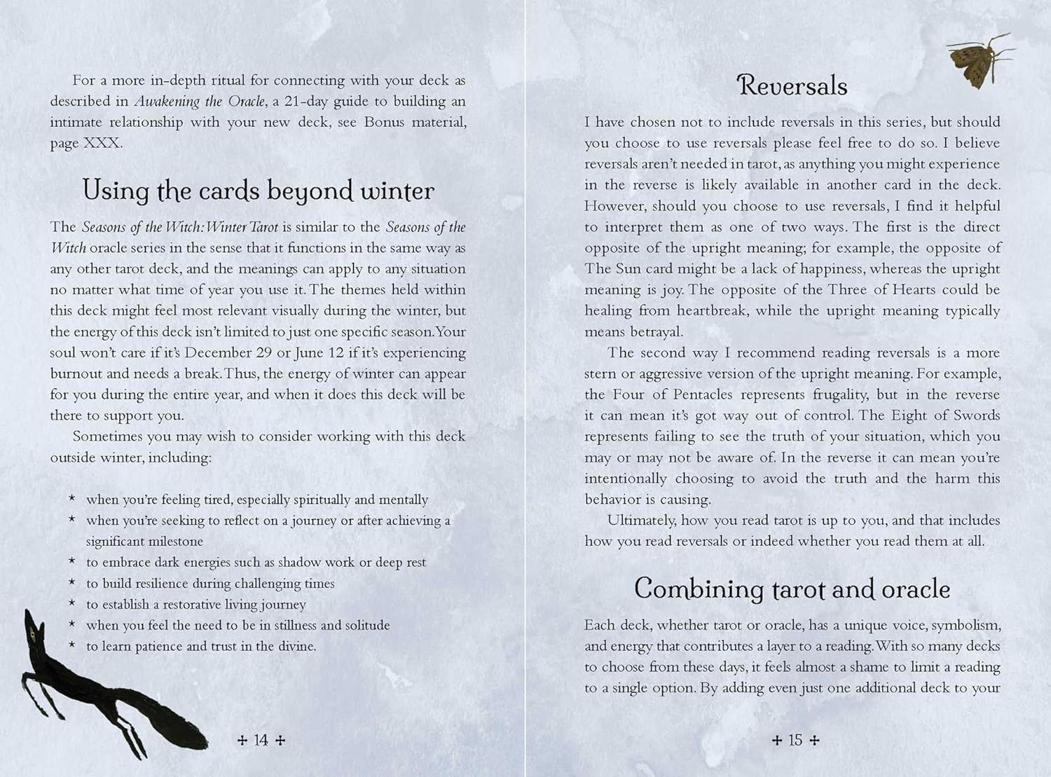 Where one journey ends, a new one begins and the wheel turns yet again . . .The bestselling Seasons of the Witch series continues its odyssey, this time unveiling a beautiful, brand new series featuring the four seasons: spring, summer, fall and winter. We begin our adventure with the Winter Tarot, where familiar elements of the tried and true Rider-Waite Smith system are reimagined in an evocative story of festive maidens, snowy creatures and frosty potions; brews and magical tools. Seventy-eight cards unearth wintry themes of rest, reflection and - of course - the sabbats too. Explore how the harmonic relationship between Yule, Imbolc and the earth's barest season seamlessly blend to unlock deep, divinatory wisdom, all while embracing a new way for the tarot to shift its energy throughout the year.