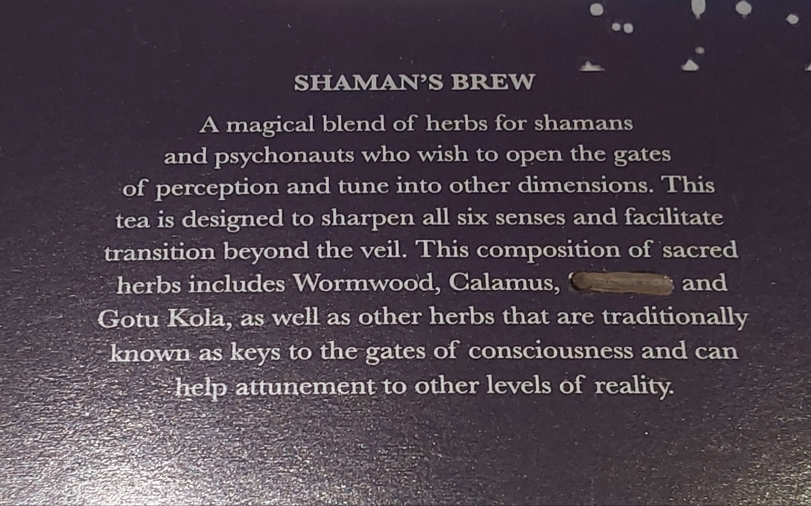 A magical blend for those who like to open the gates of perception and tune into the more subtle levels of reality. This tea is designed to sharpen all 6 senses and facilitate transition beyond the veil.