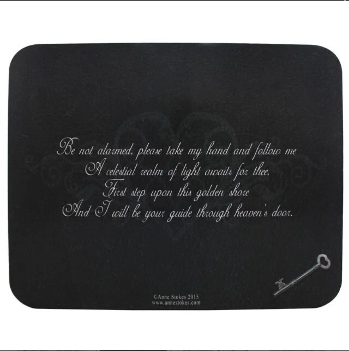 An Anne Stokes Spirit Board in the Spirit Guide design. The back of the board features a sentimental poem. Comes with a planchette and instructions as pictured. This spirit board is designed for light-hearted entertainment and is not a professional tool for making spiritual connections.