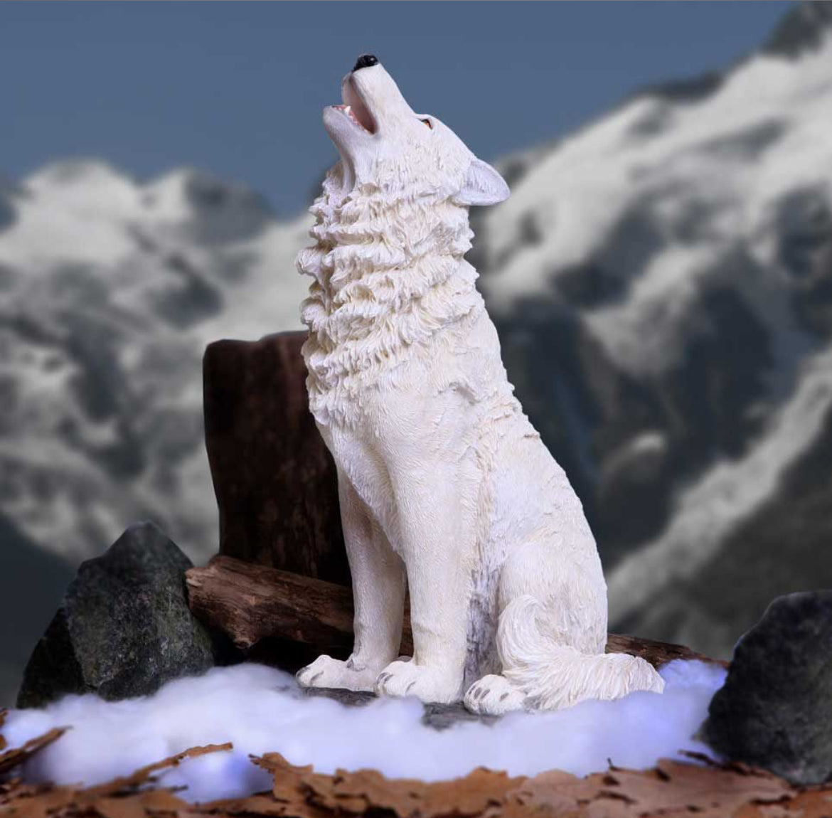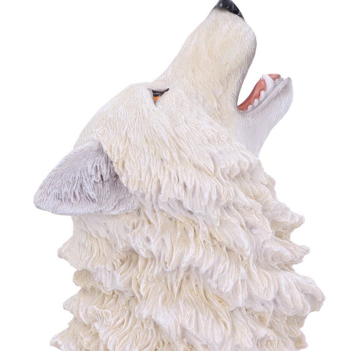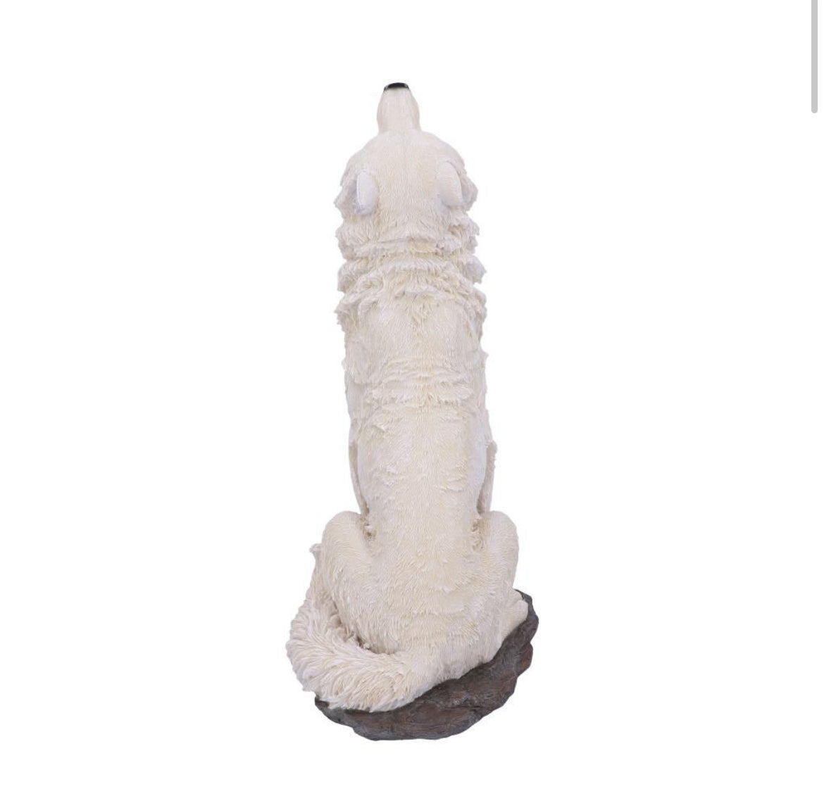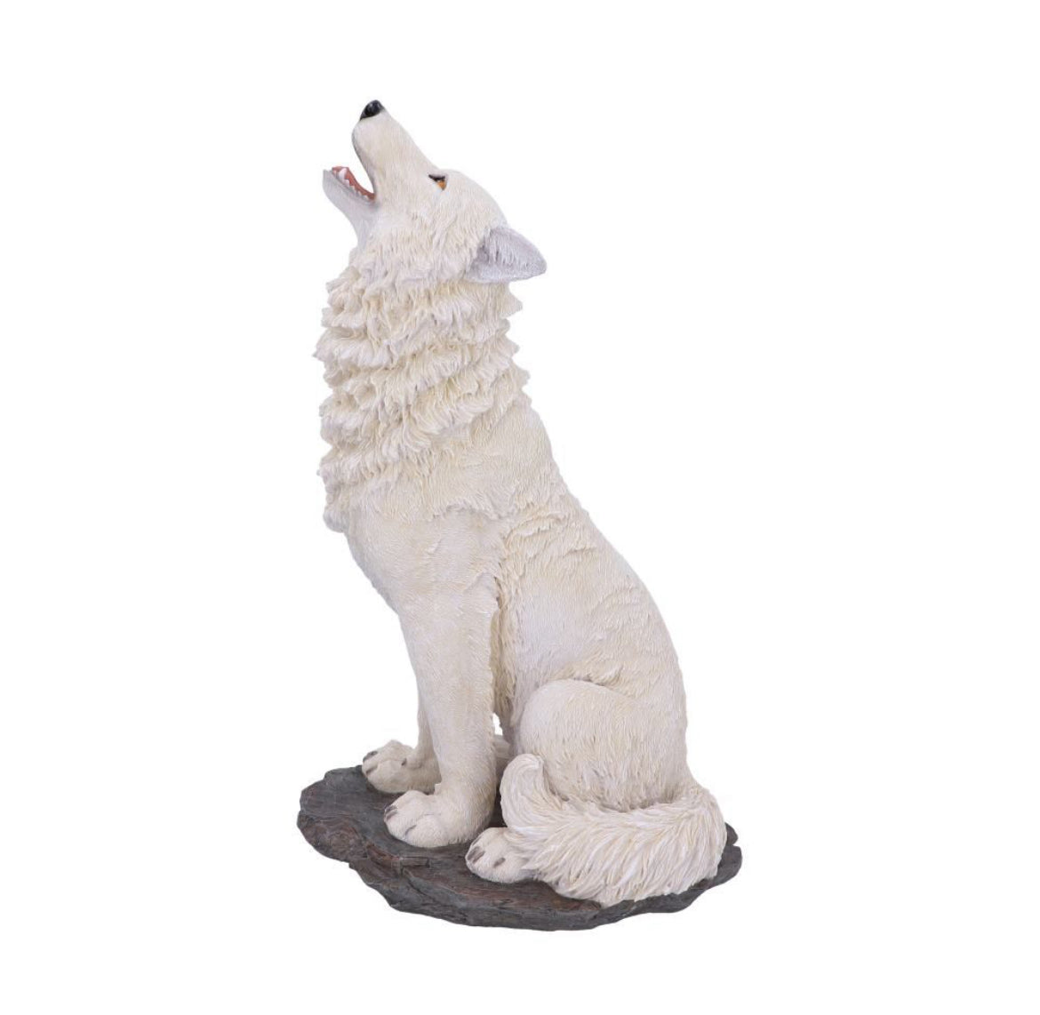 From alternative brand Nemesis Now, this enchanting wolf figurine will bring the wild into any space. Sitting on a rocky outcrop, this imposing white wolf stares to the sky with fierce orange eyes while calling their pack. Their stare betrays a preternatural intelligence and wisdom, signalling that this no ordinary wolf. Cast in top-quality resin before being lovingly hand-painted, this figure is perfect for anyone who feels the call of the wild. 41.5cm