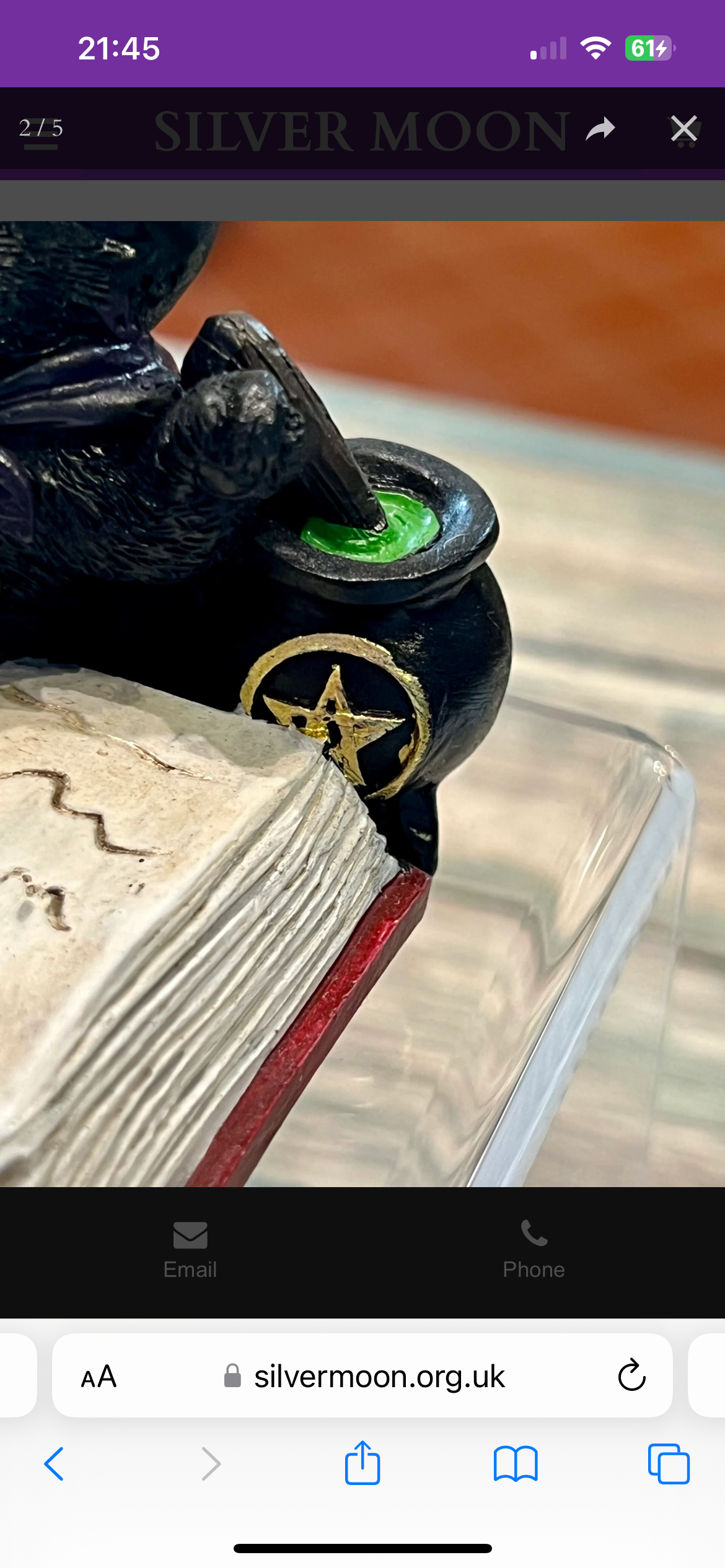 Here we have our familiar ready to cook up his spell. He has his spell book ready and his cauldron simmering. All he needs is a witch to guide him. Are you the witch he seeks. Meadures approximately 7.6cm in height