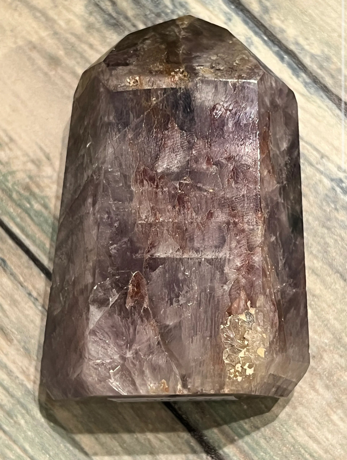 This stone is a mixture of all of these seven crystals; Amethyst, Smokey Quartz, Clear Quartz, Rutilated Quartz, Geothite, Lepidochrosite and Cocoxenite. It holds all the properties of all seven crystals. It retains its own energy and never needs either cleansing or energising.