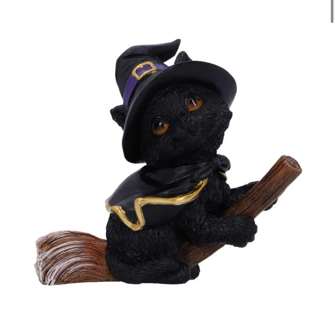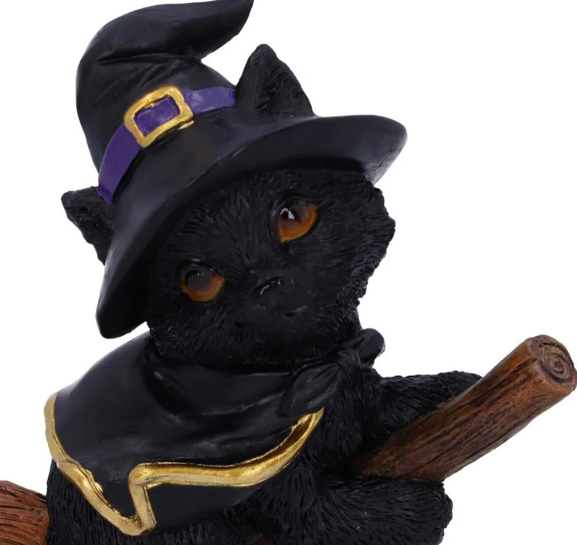 Tabitha is feeling playful while clasping a small broom. With a black witches hat on her head, she is ready to take flight making this the perfect gift for any witch.