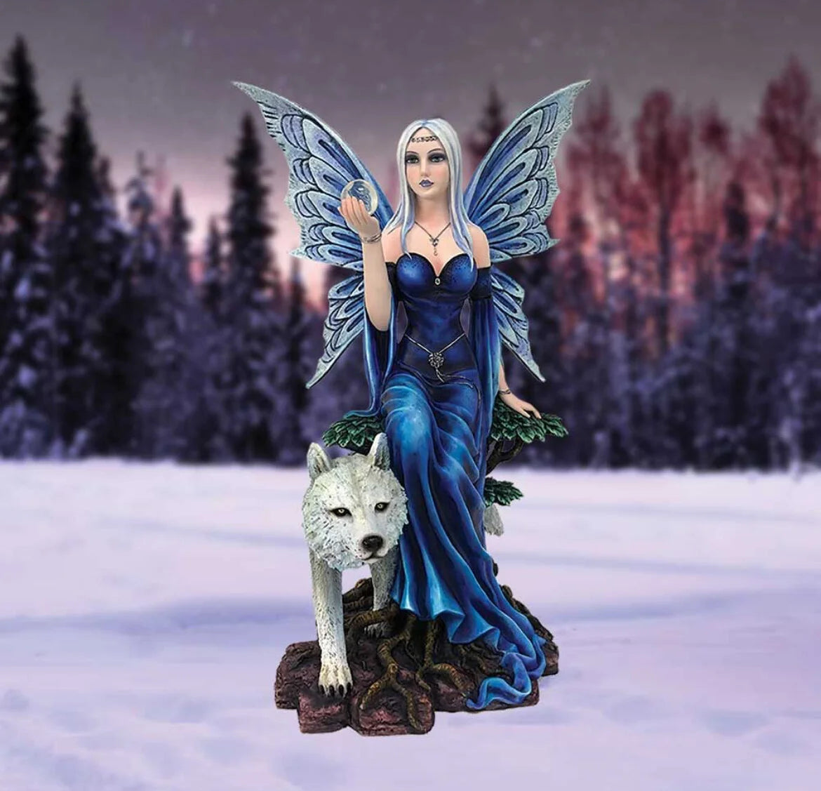 A beautifully presented silver haired Fairy and a white wolf gather around a heavily rooted tree. the eerily light Fairy sits on the tree as the wolf skulks over the many roots. The Fairy wears a long-flowing deep blue strapless dress which flows from her chest to the tree roots below. She holds up her right arm, in her hand is a translucent orb which she stares fixedly into. Behind, her wings are elegantly detailed with alternating patterns that are highlighted by different shades of blue. Cast in the finest resin before being lovingly hand-painted, this fantastic Fairy figurine is perfect for any shelf or mantelpiece.