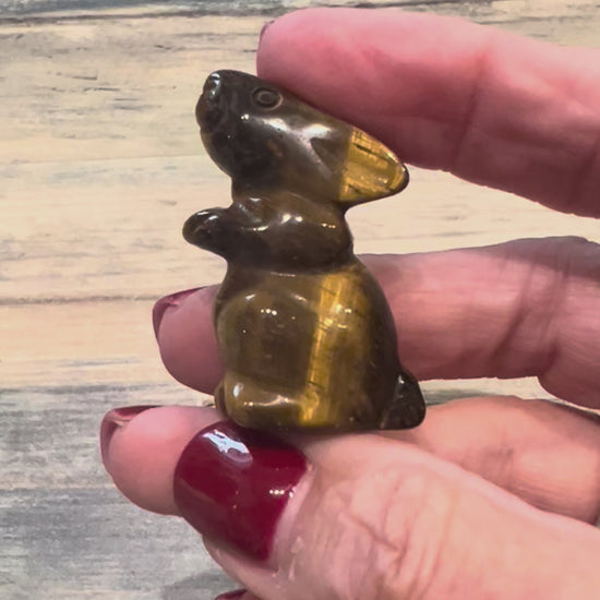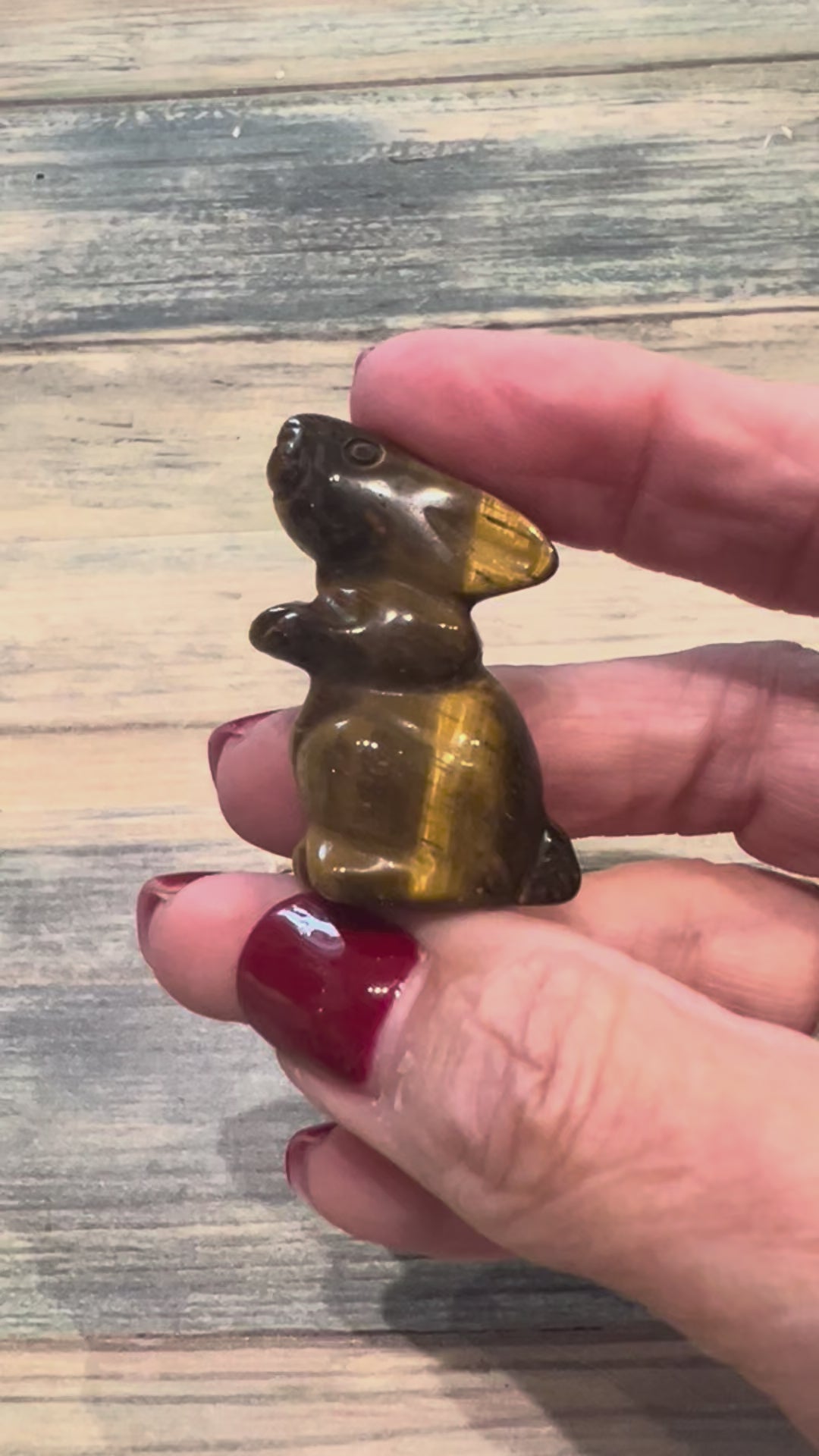 This adorable Tigers Eye hare is seeking his forever home. Hare symbolism includes fertility, vitality, and renewal due to their prolific breeding, and they have been linked to deities like Venus/Aphrodite. They also represent luck, immortality, and connection to the moon in various cultures, such as the Chinese jade hare that brews an elixir of immortality, and can symbolize Christian concepts of rebirth and hiding, and the Celtic concept of good fortune.