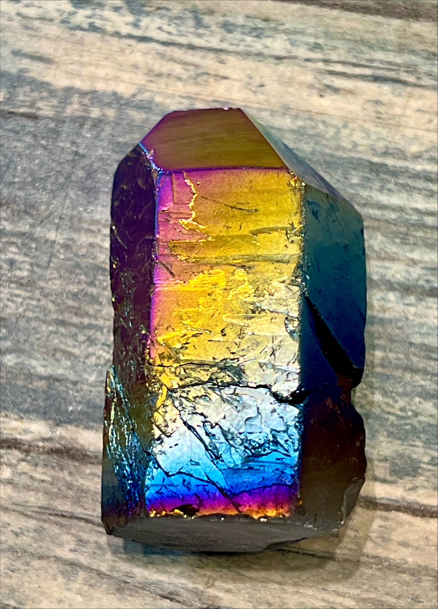 Titanium Quartz is a man-made, uniquely coated type of Quartz. It is created by bonding quartz and titanium together to form an alluring dark metallic iridescent effect. A stone of mental fortitude, Titanium Quartz strengthens emotional resilience, sharpening focus and helping you remain steadfast amidst life's uncertainties. It nurtures the healing of relationships by fostering forgiveness and compassion. Measures approximately 5cm height