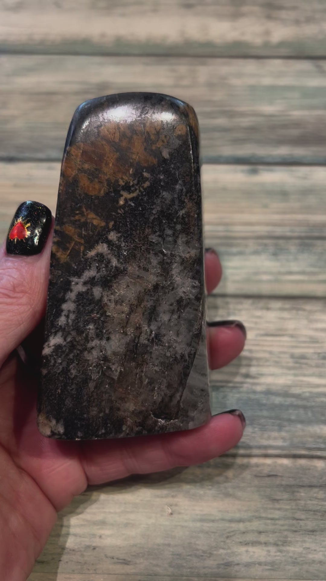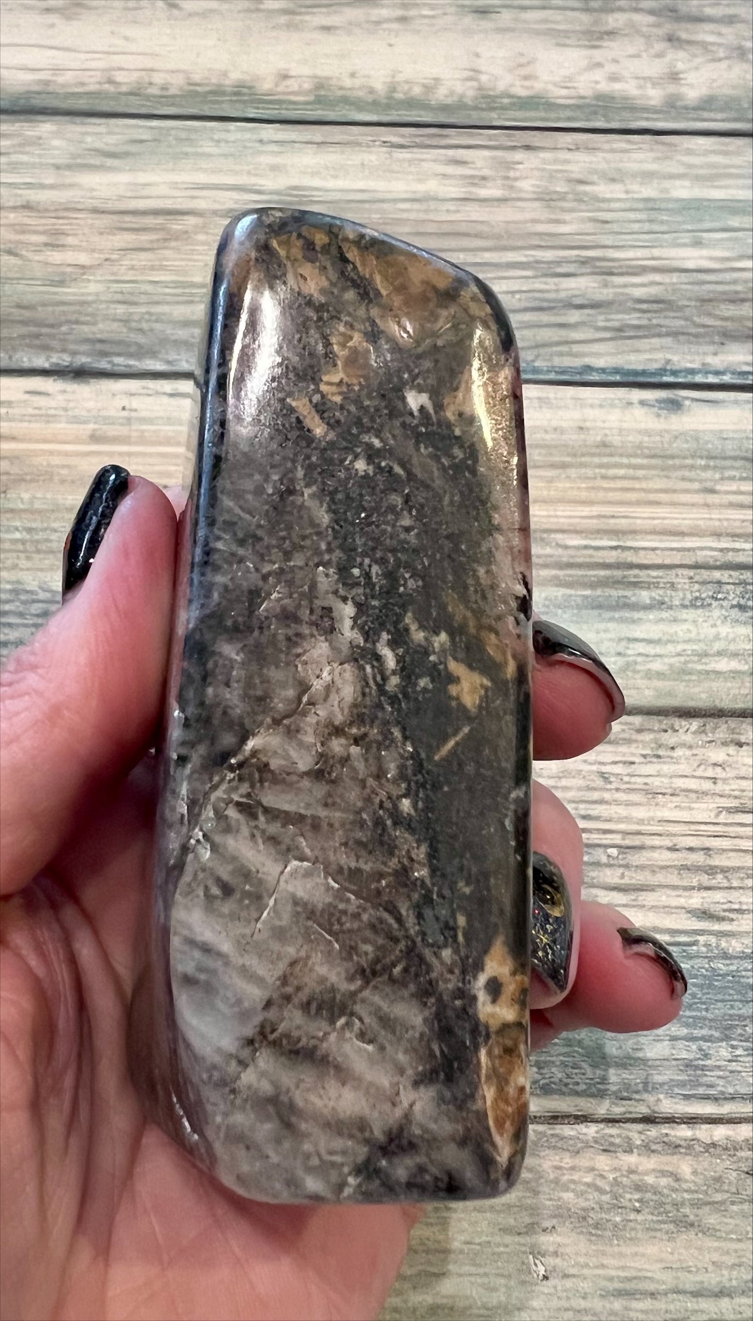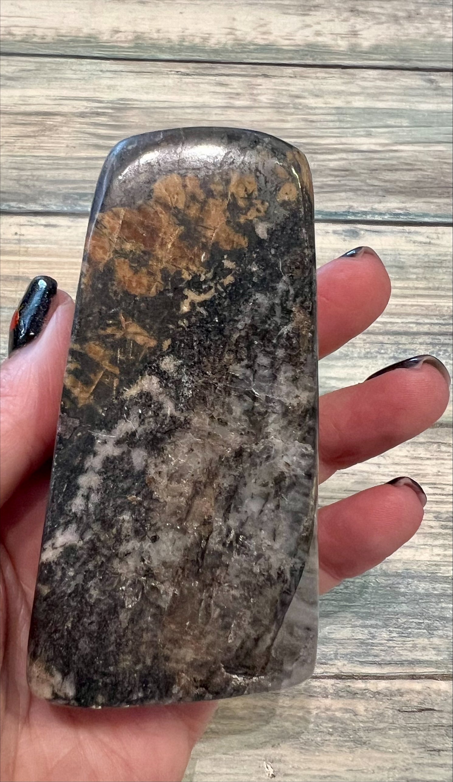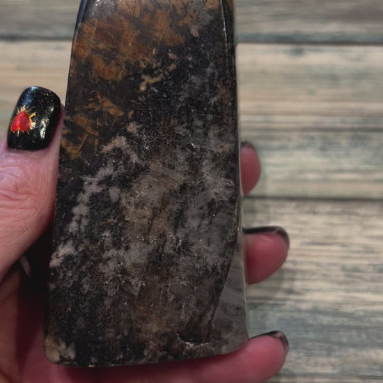 Rhodonite is often used to heal emotional wounds and traumas. It encourages the release of past pain and sorrow, helping individuals come to terms with difficult experiences. This leads to emotional balance and inner peace. This crystal promotes self-love and self-acceptance. Approximately 9cm height with a base of 4.5cm by 2.5cm