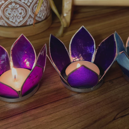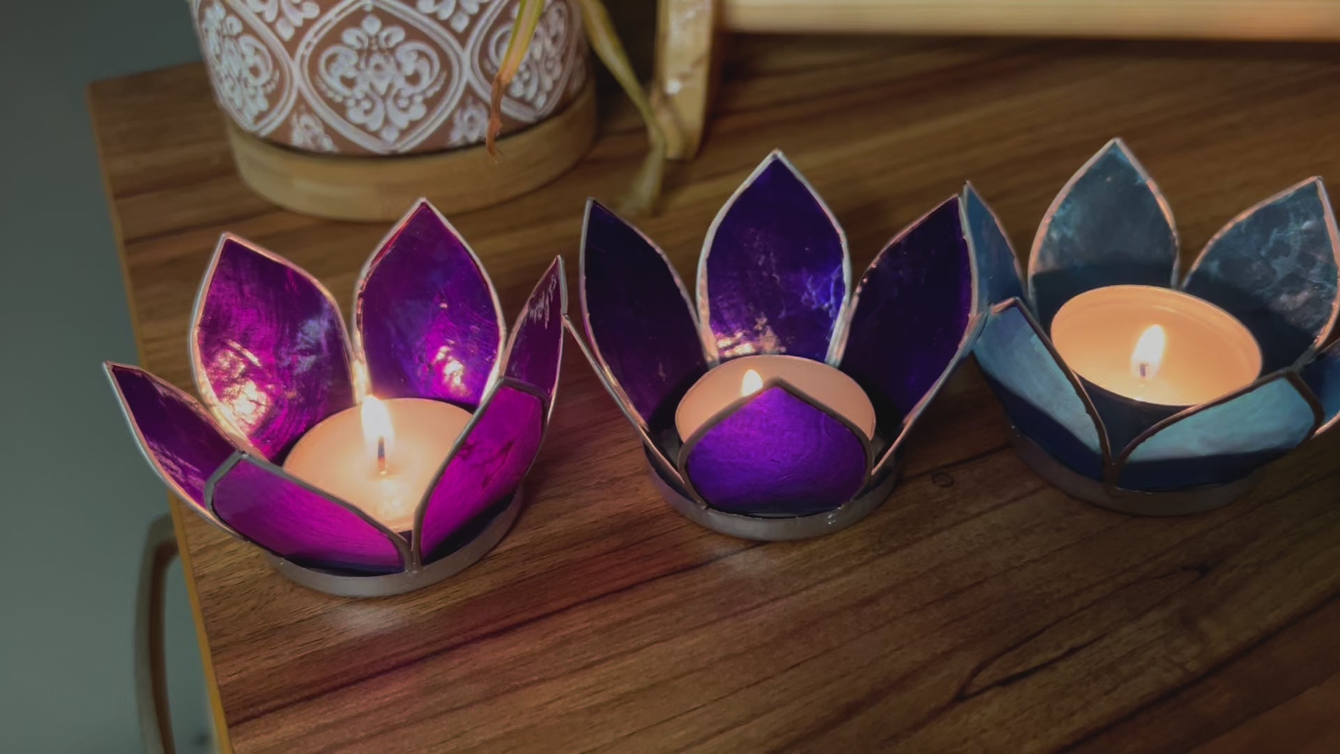 A set of 7 Lotus Candle Holders made from Capiz Shell, can be used to hold tea-lights. 'Capiz' is a type of Oyster (also known as the Windowpane Oyster) that can be found abundantly in the coastal waters near India and the Philippines. The candle holders are hand-made in the Philippines.