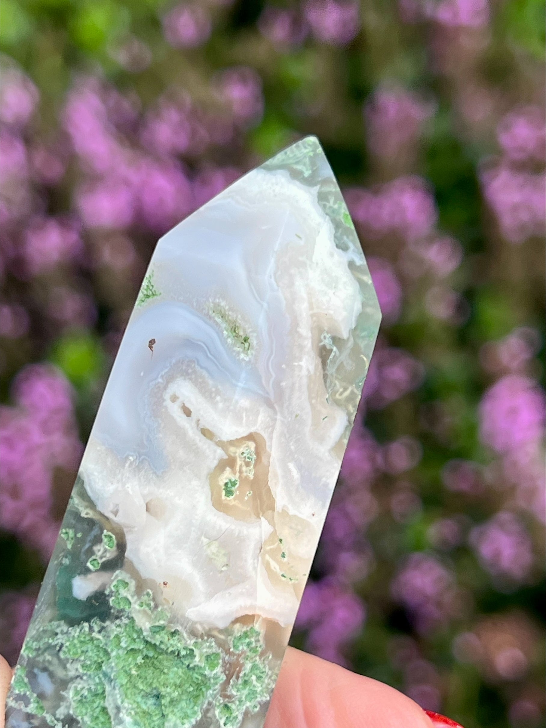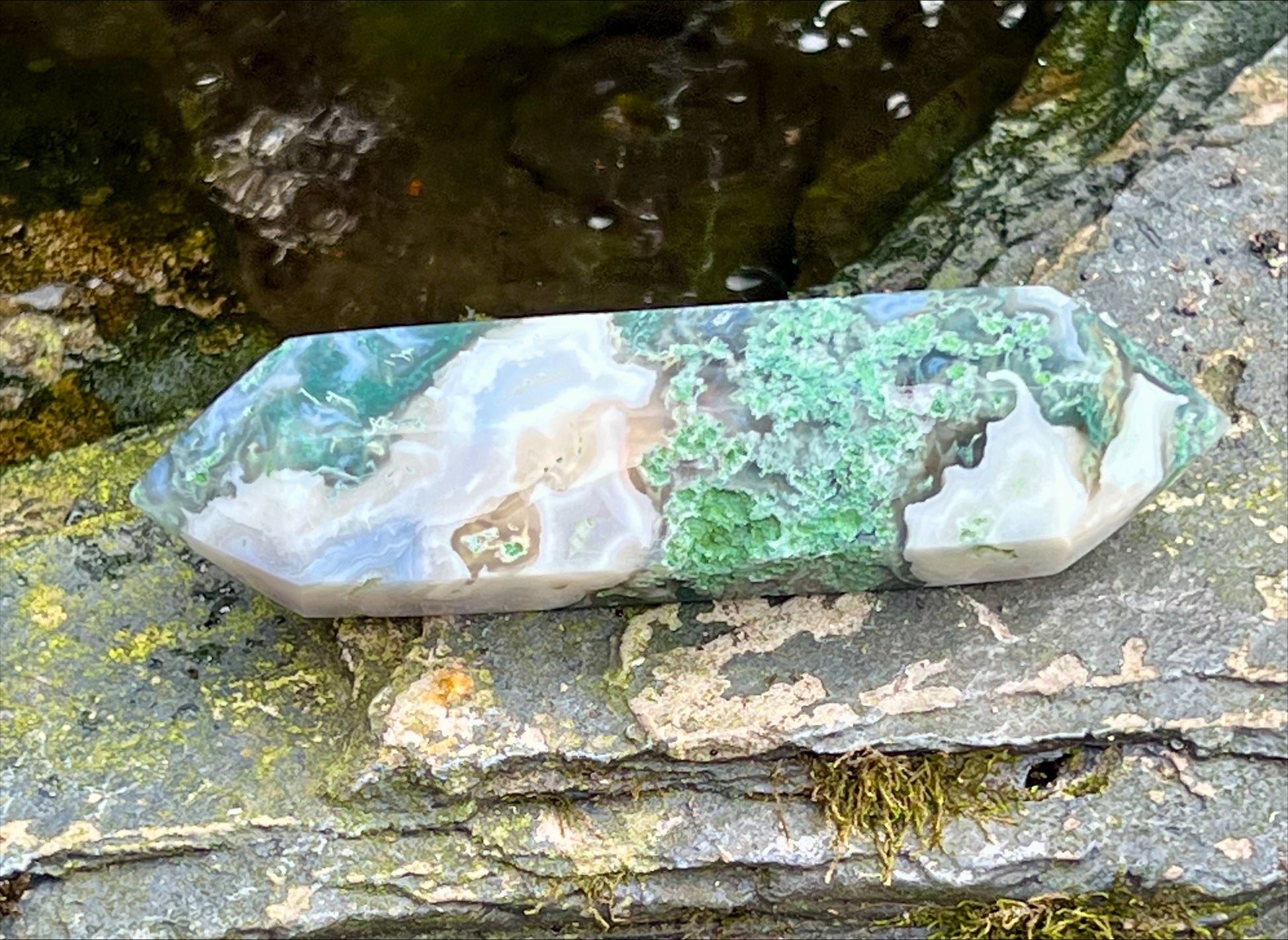 Outstanding quality, double terminated, moss agate wand. This piece really is stunningly beautiful. In addition to its nurturing and uplifting qualities, moss agate is also known for its protective and grounding properties. This crystal can help shield individuals from negative energies, while also anchoring them to the earth's stabilizing forces, promoting a deep sense of security and inner calm. Measuring approximately 9.5cm length