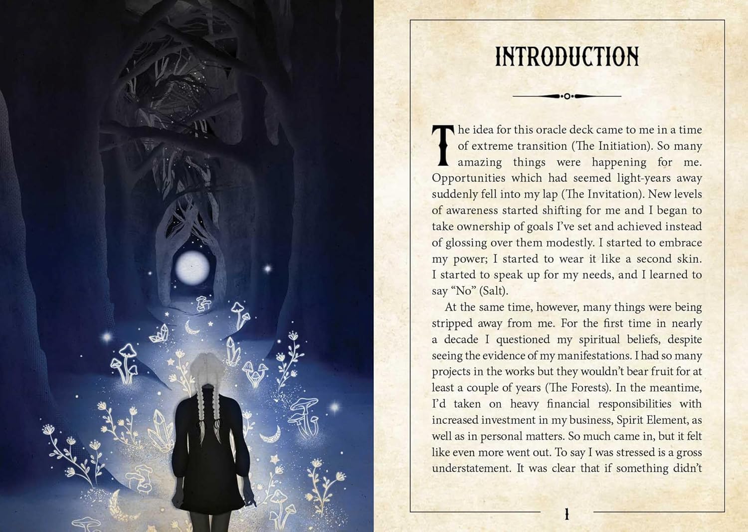 Welcome to a journey through the awakening of a witch to her inner power. Each card in this oracle represents an evolutionary step a budding witch might encounter as she begins to walk the path of a mystic.