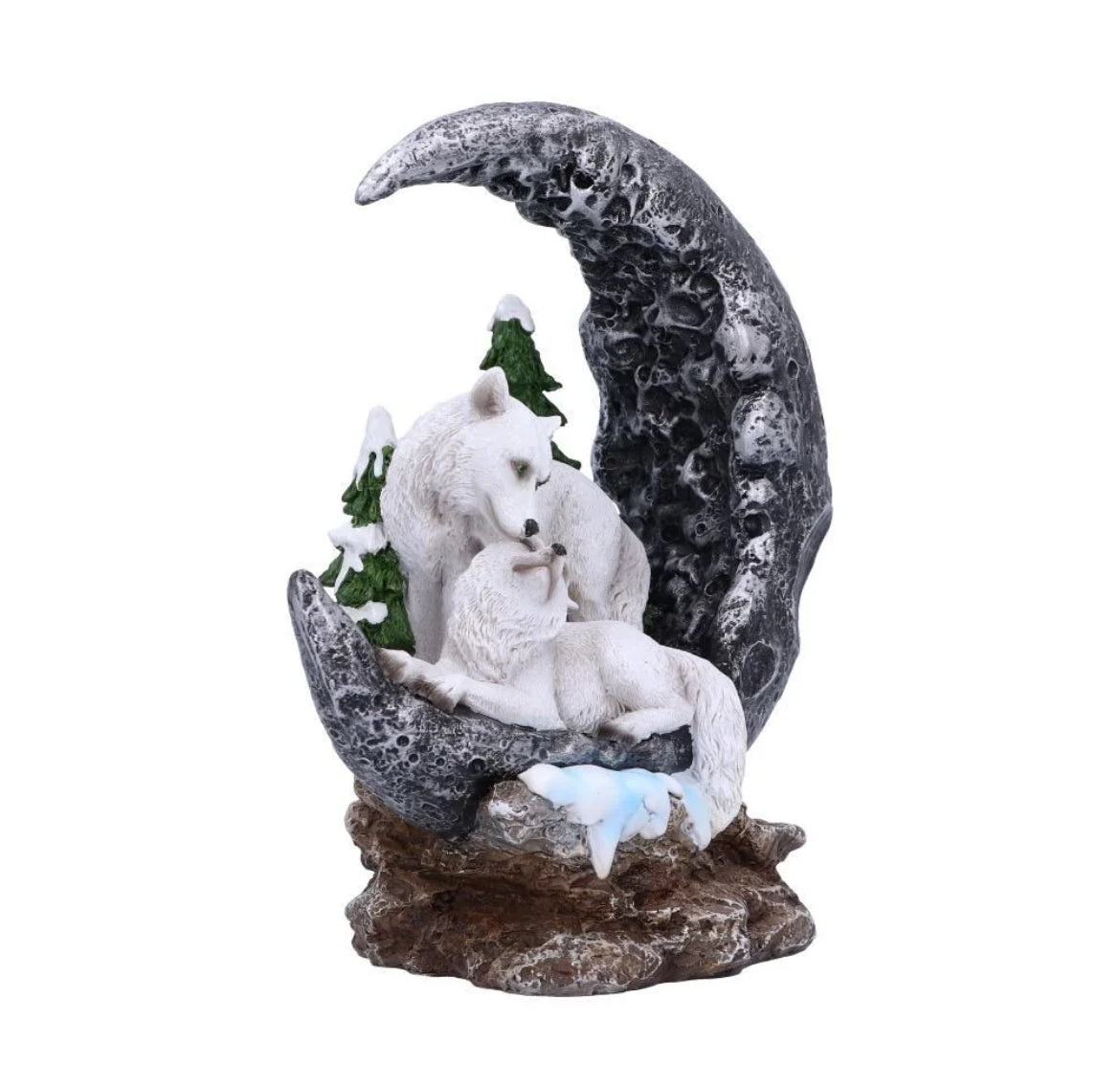Capturing the serene beauty of nature, these two majestic wolves are perched upon a crescent moon, surrounded by a snowy landscape. The cresent moon lights up to show them in their stunning beauty. Measuring 19.3cm this would be the perfect edition to any mystical collection.
