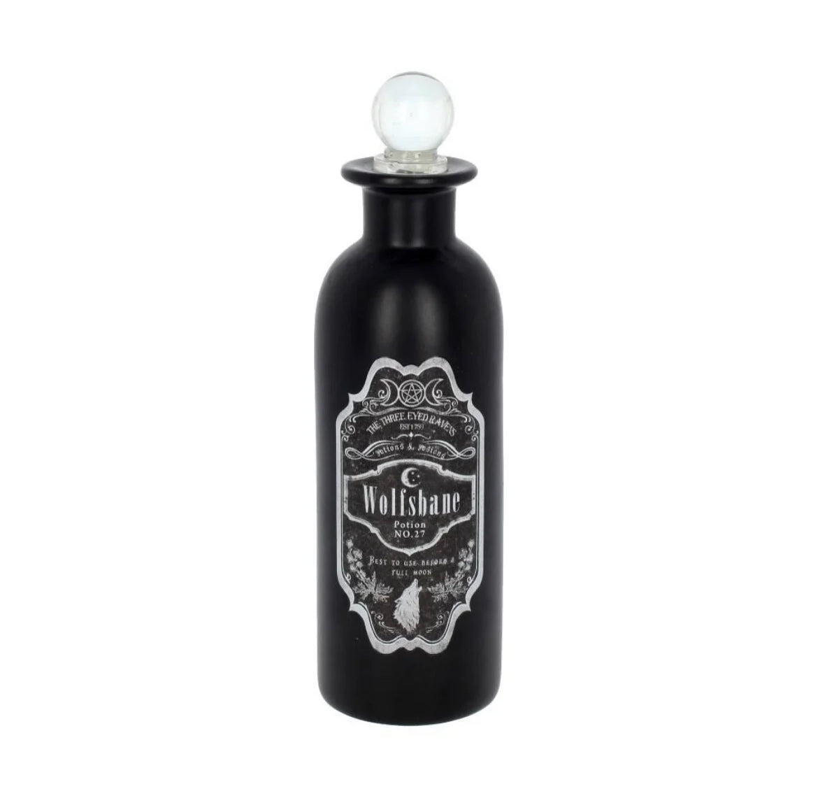 This unusual bottle features an old label that reads 'the three eyed ravens, potions and poisons, Wolfsbane potion No 27, best to use before a full moon'. Above the label is a pentagram, surrounded by the sign of the triple moon. The perfect gift for those who embrace their dark side.